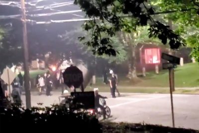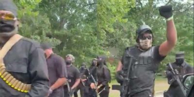Captura de pantalla que muestra a un grupo de manifestantes en su mayoría afroamericanos armados caminando hacia Stone Mountain Park ... -