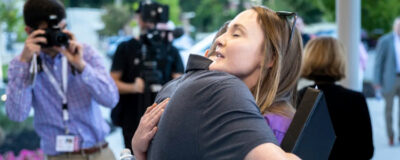 La maestra de Cobb, Katie Rinderle, a la derecha, abraza a Jack Lakis, un reciente graduado de la Preparatoria Harrison, ...