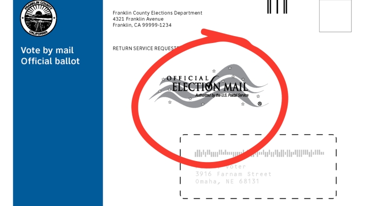 Caption: Sobre con el sello oficial del correo de las elecciones en el estado de California