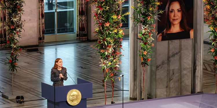 OSLO, Noruega.– La ceremonia del Premio Nobel de la Paz 2025 tuvo un momento cargado de simbolismo este domingo, cuando Ana Corina Sosa Machado, hija de la dirigente opositora venezolana María Corina Machado, subió al escenario para recibir el galardón en nombre de su madre.
