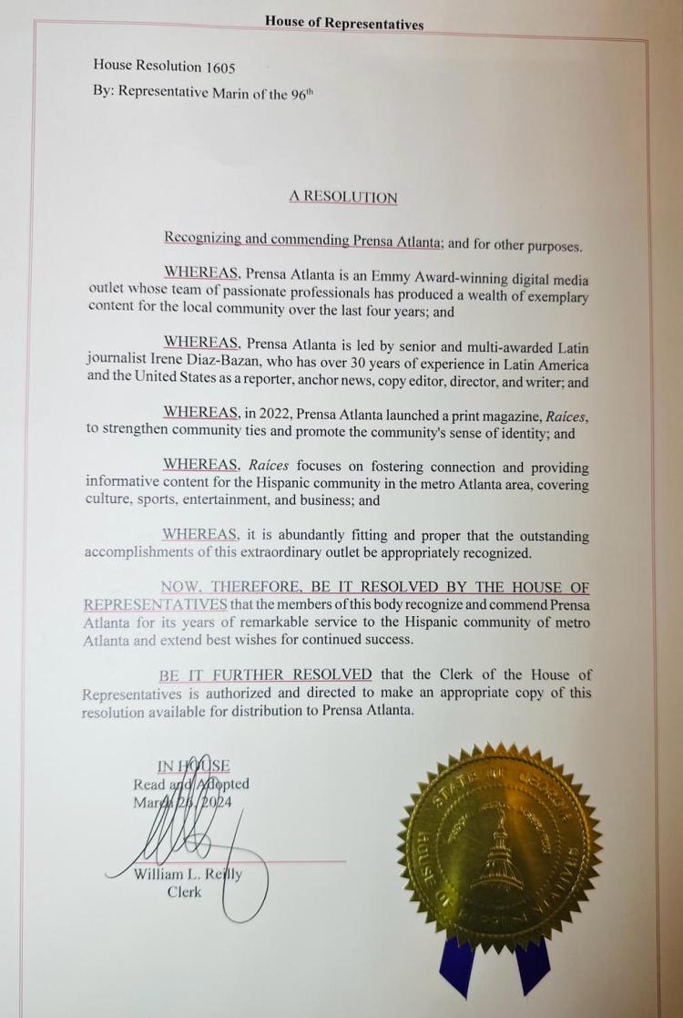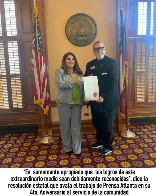 Atlanta, Georgia.- (28 de marzo) A través de una RESOLUCIÓN estatal, Prensa Atlanta, un medio de comunicación comunitario con sede en el condado de Gwinnett, fue reconocido por la Cámara Estatal de Georgia.