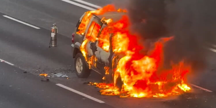 El incidente ocurrió cerca de la salida 14th Street alrededor de las 4:45 p.m. del jueves, cuando el automóvil comenzó a arder repentinamente en medio del tráfico intenso. Las autoridades cerraron todos los carriles mientras los equipos de emergencia trabajaban para controlar las llamas y asegurar la zona.